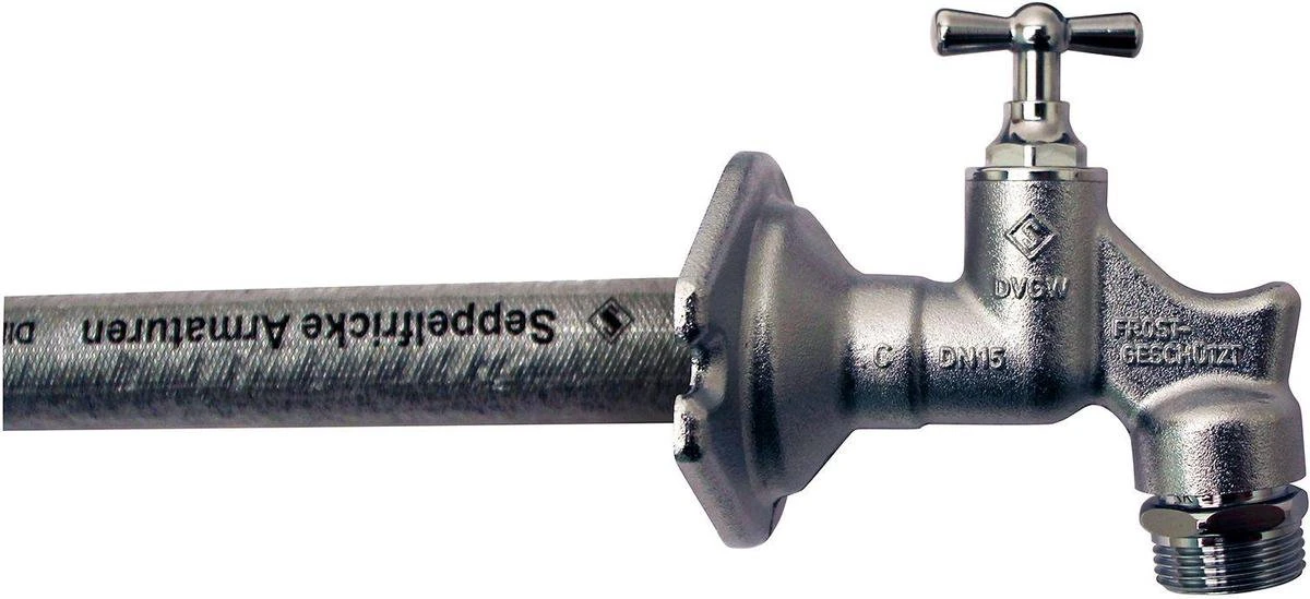Deze VSH SEPP Eis vorstvrije buitenkraan krukbediening is gemaakt van verchroomd messing en is de ideale gevelkraan voor uw huis. De SEPP Eis is een vorstvrije gevelkraan die niet nadruppelt bij het dichtdraaien. Bij bevriezing wordt het water automatisch geabsorbeerd in de doorvoerbuis waardoor vorstschade voorkomen wordt.De buitenkraan is geschikt voor enkel of dubbelsteens muren, eventueel voorzien van pleisterwerk met een muurdikte tussen de 135 en 500 mm. De SEPP Eis is snel te monteren dankzij de insteekverbinding. Bekijk de onderstaande video voor meer informatie.De aansluiting van de toevoer van de waterleiding kan via de 1/2” buitendraad aansluiting.
